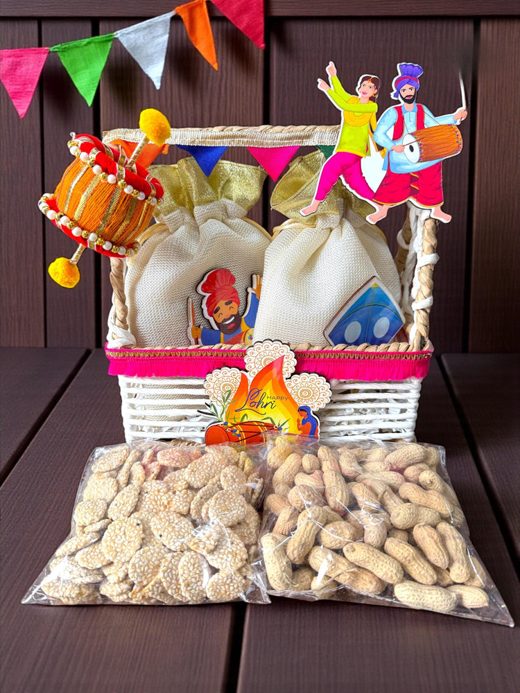 Simple, elegant, and rooted in tradition — the Lohri Minimal Basket Hamper is perfect for those who appreciate understated festive gifting. Packed in a reusable iron straw basket, this hamper includes two beautifully themed potlis filled with premium peanuts and gur revri. The minimal design, combined with quality festive essentials, makes it ideal for corporate gifting, society events, and bulk orders. A tasteful way to share Lohri warmth while keeping things neat, reusable, and meaningful.